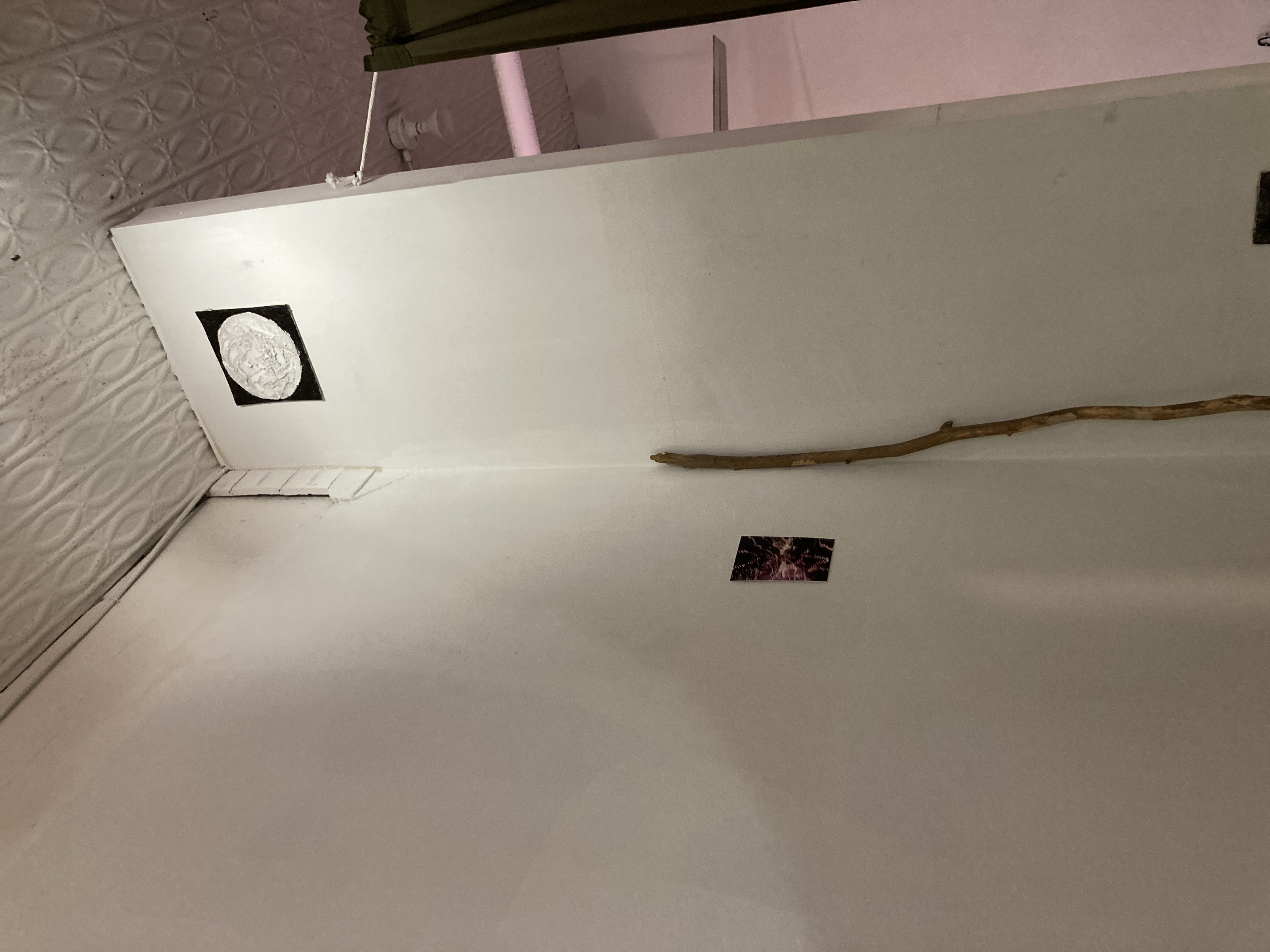 A series of small paintings on found tile installed in utilitarian places where light switches and outlets would be.