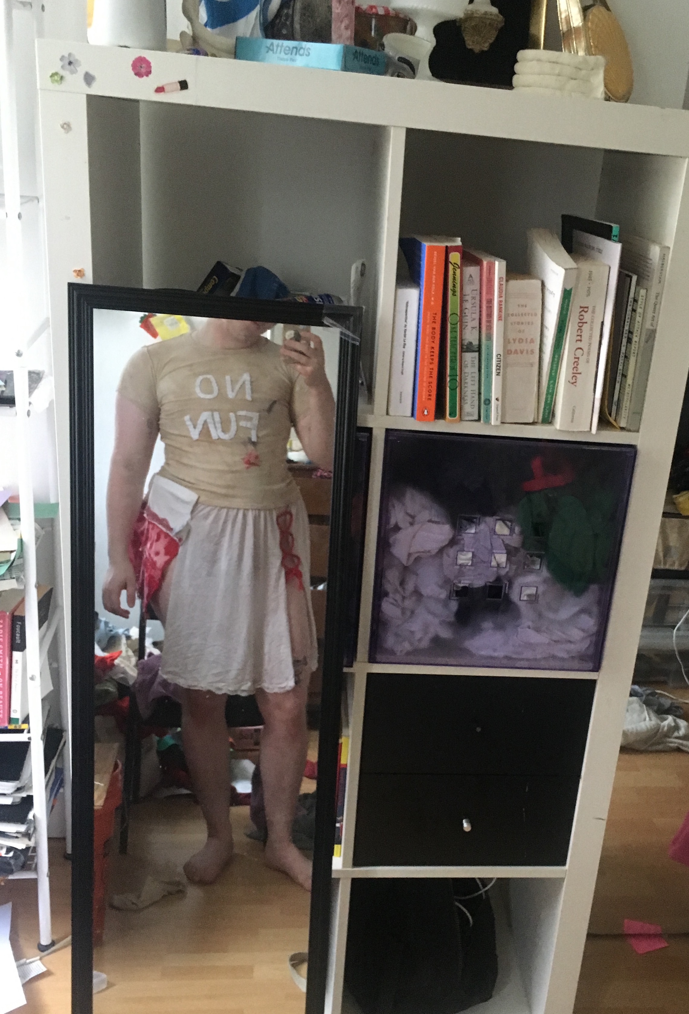 The Slut Dress (2018) found fabric, found photo, scarf from teenage trip to France, shirt dyed with tea and avocado pit, ribbons