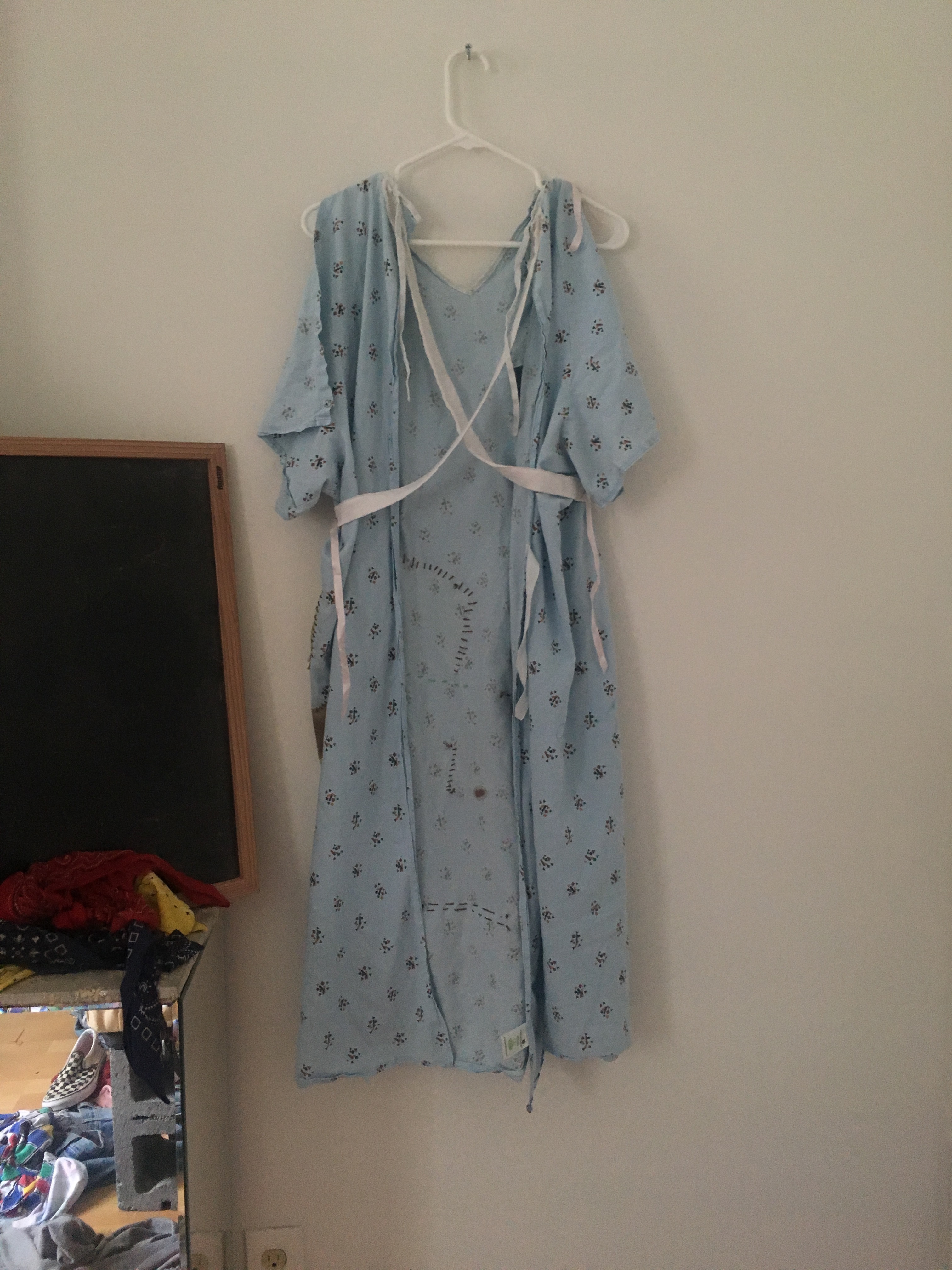 Hospital Gown (2018) hospital gown that I was operated in, found fabric, ribbons, my blood