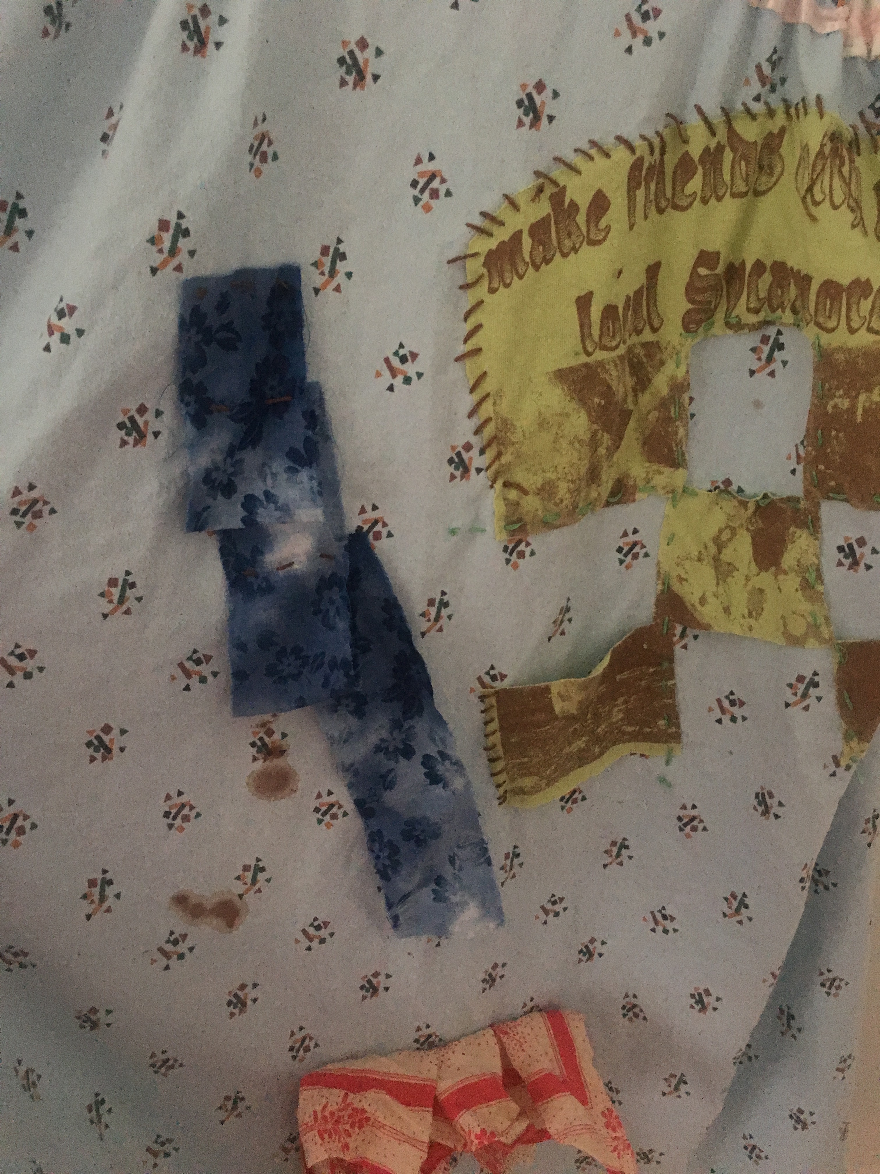 No Fun (2018) felt, plastic bug, tea shirt dyed with tea, old slip dyed with onion peels, yarn, fabric from a tea shirt painted with bleach stars, old underwear lace