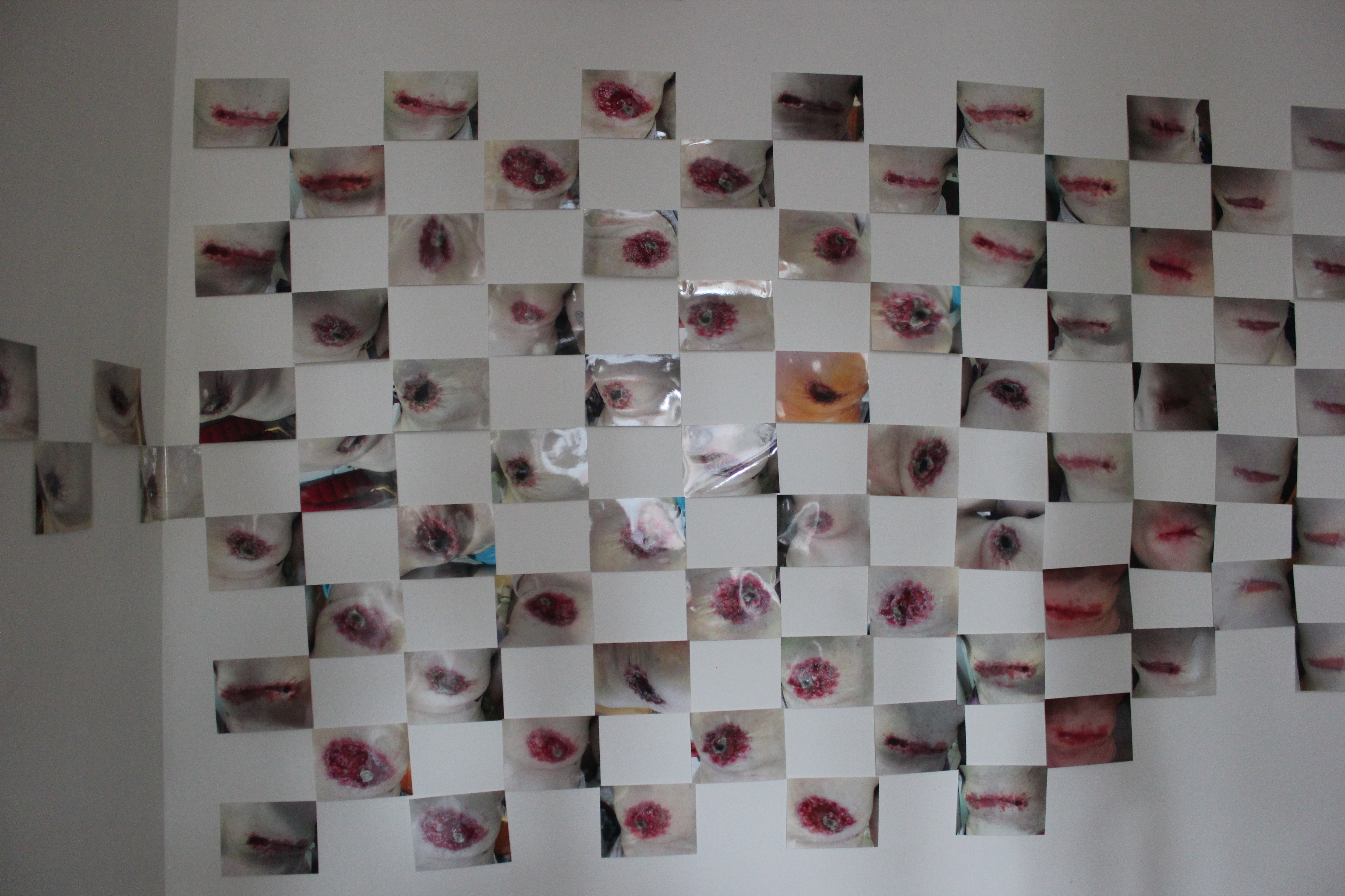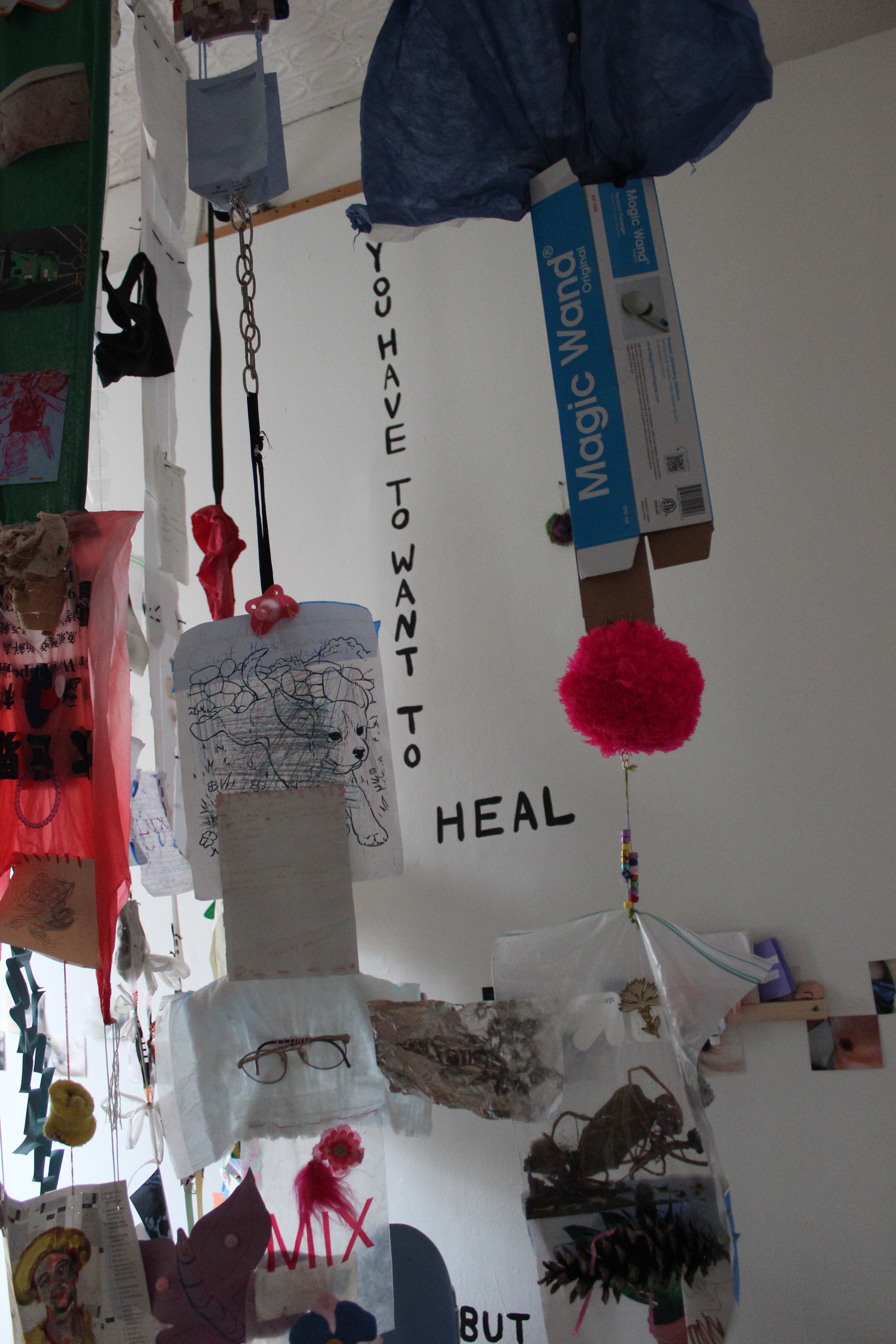 Precious trash, photos of surgical recovery, writing, a jar of blood with orbeez, a binder