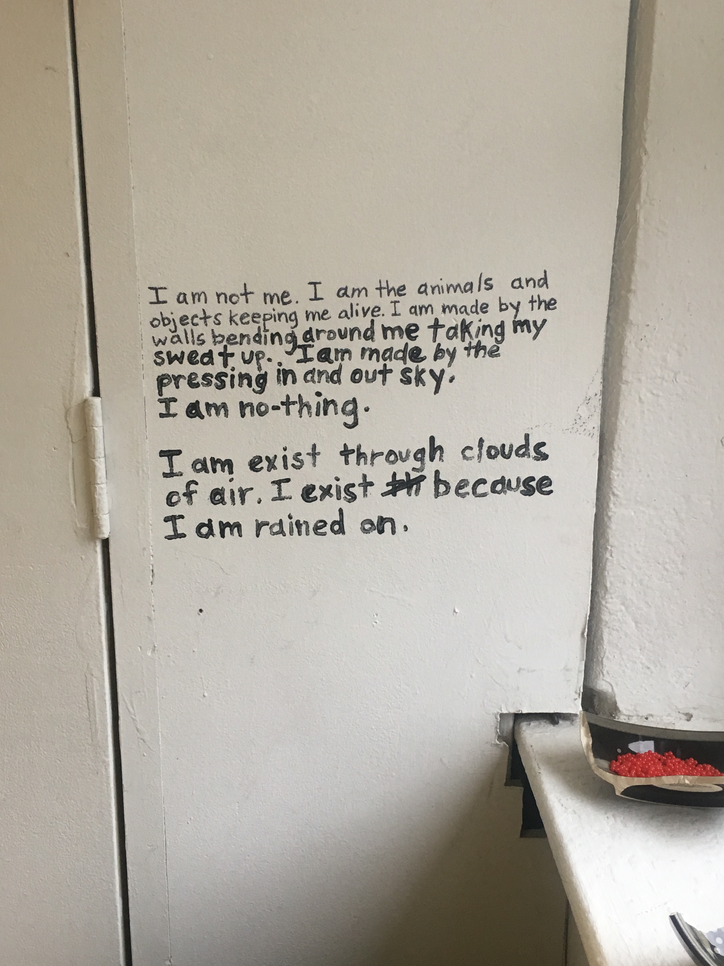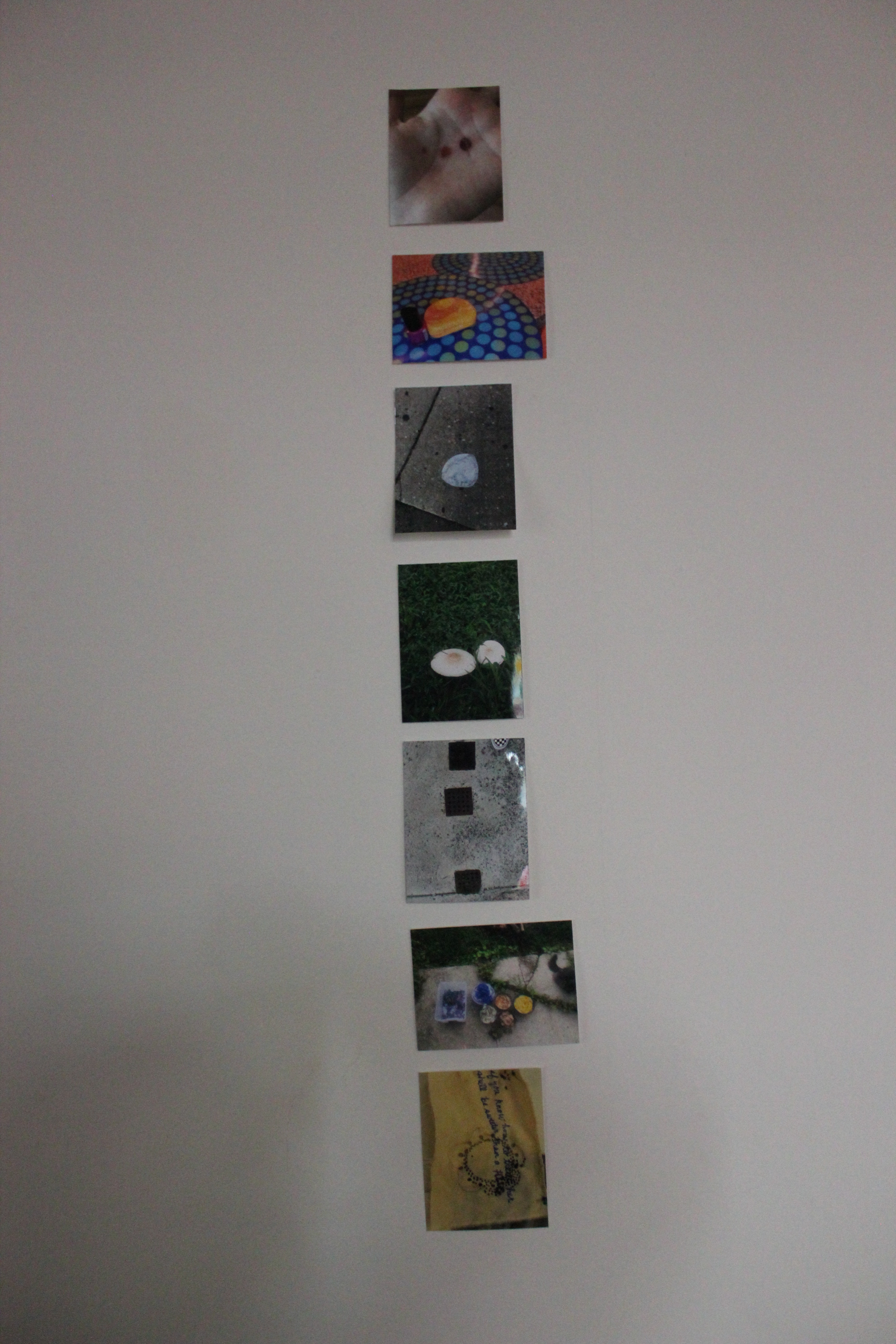 writing piece installed with a kiss, a shell, styrofoam, and a child's art
