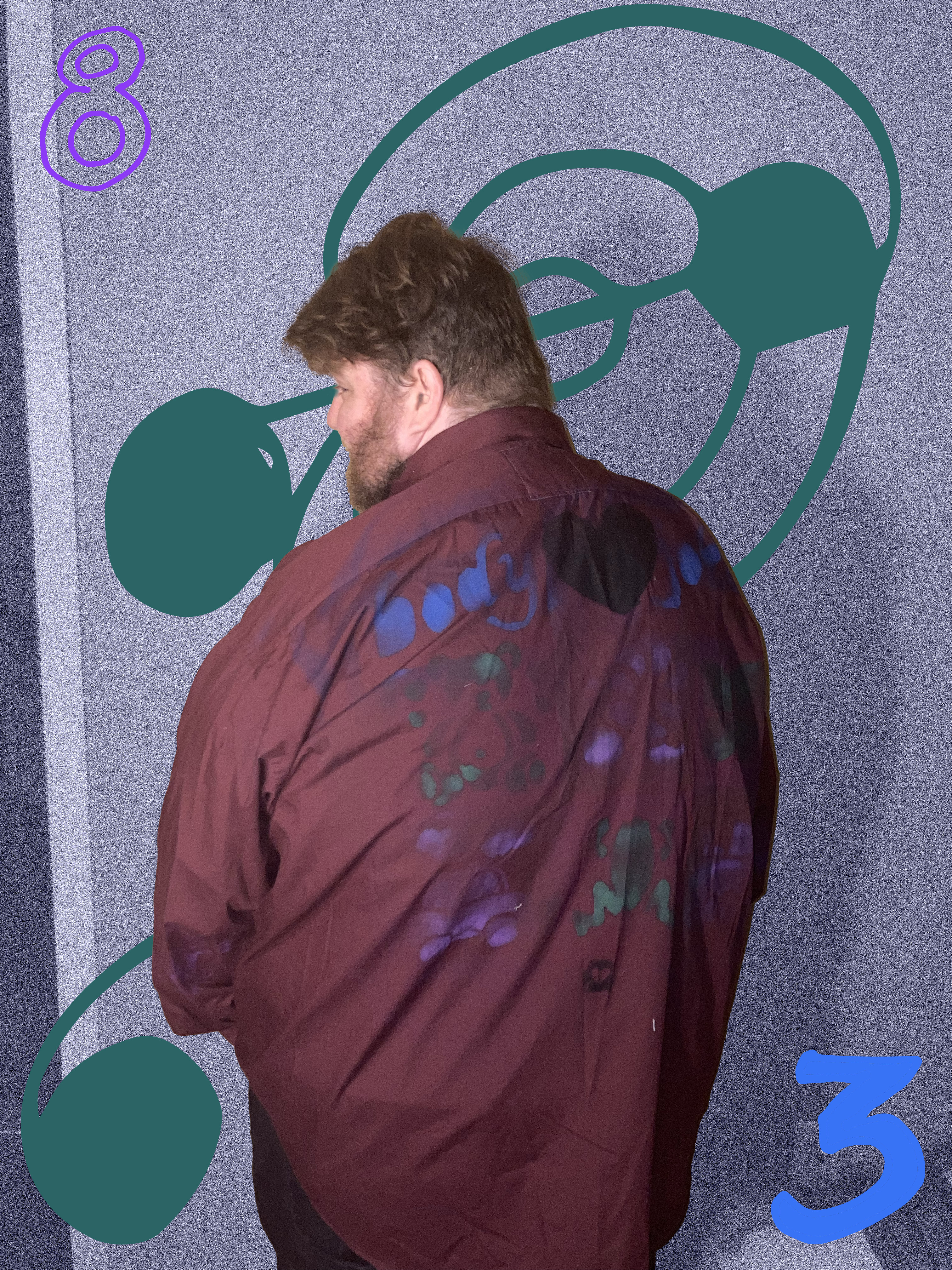 A comfy brown vest with the slut poem on the back, insect details on the front, and teal ruffles throughout.