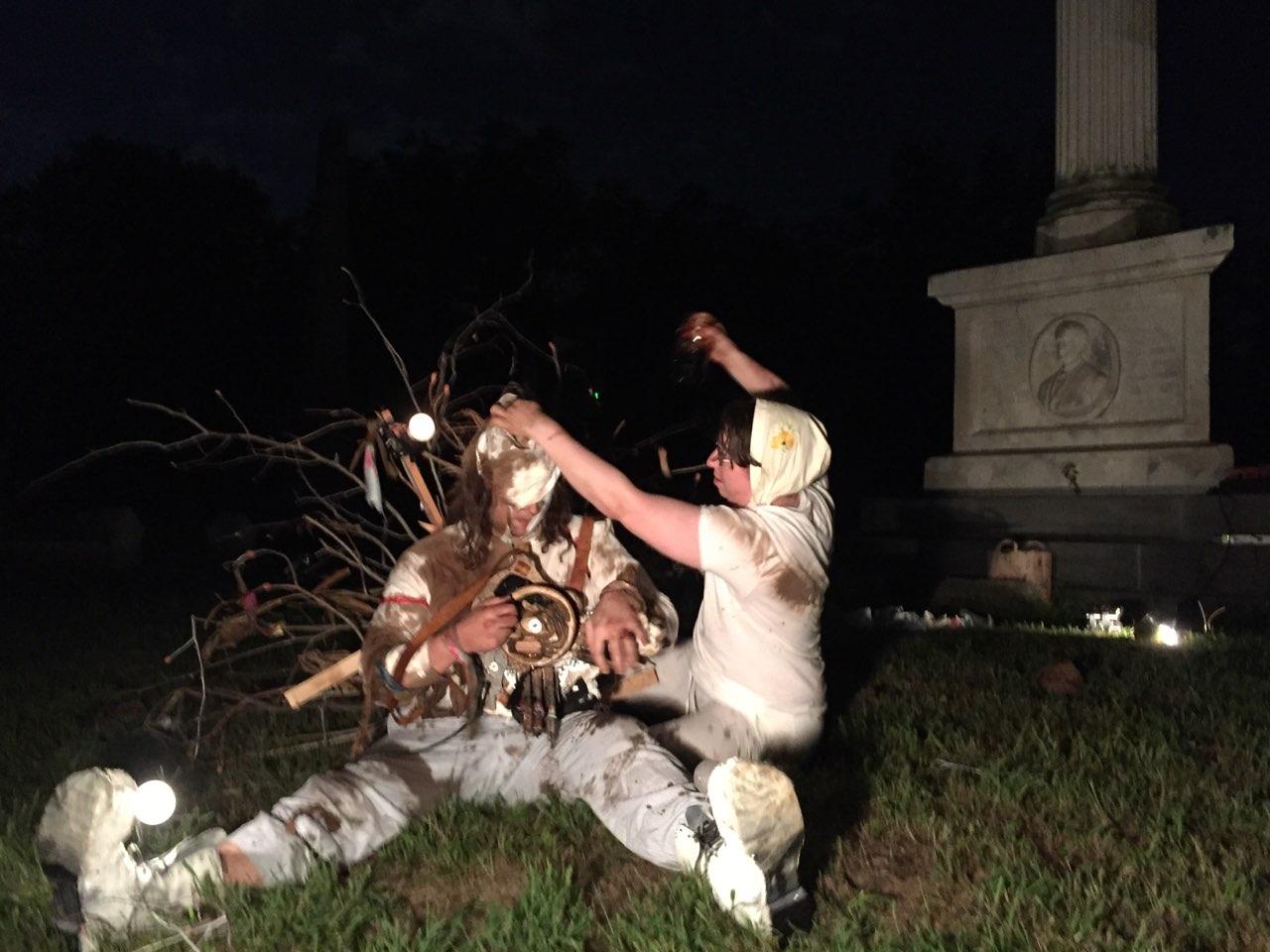 The following are pictures from an improvisation at Mount Moriah Cemetery for a show called Mutual Irradiation in Fall 2018. Jim Strong played music while Lane flung, tied, and squeezed rags soaked in black walnut dye made with walnuts found at the cemetery.