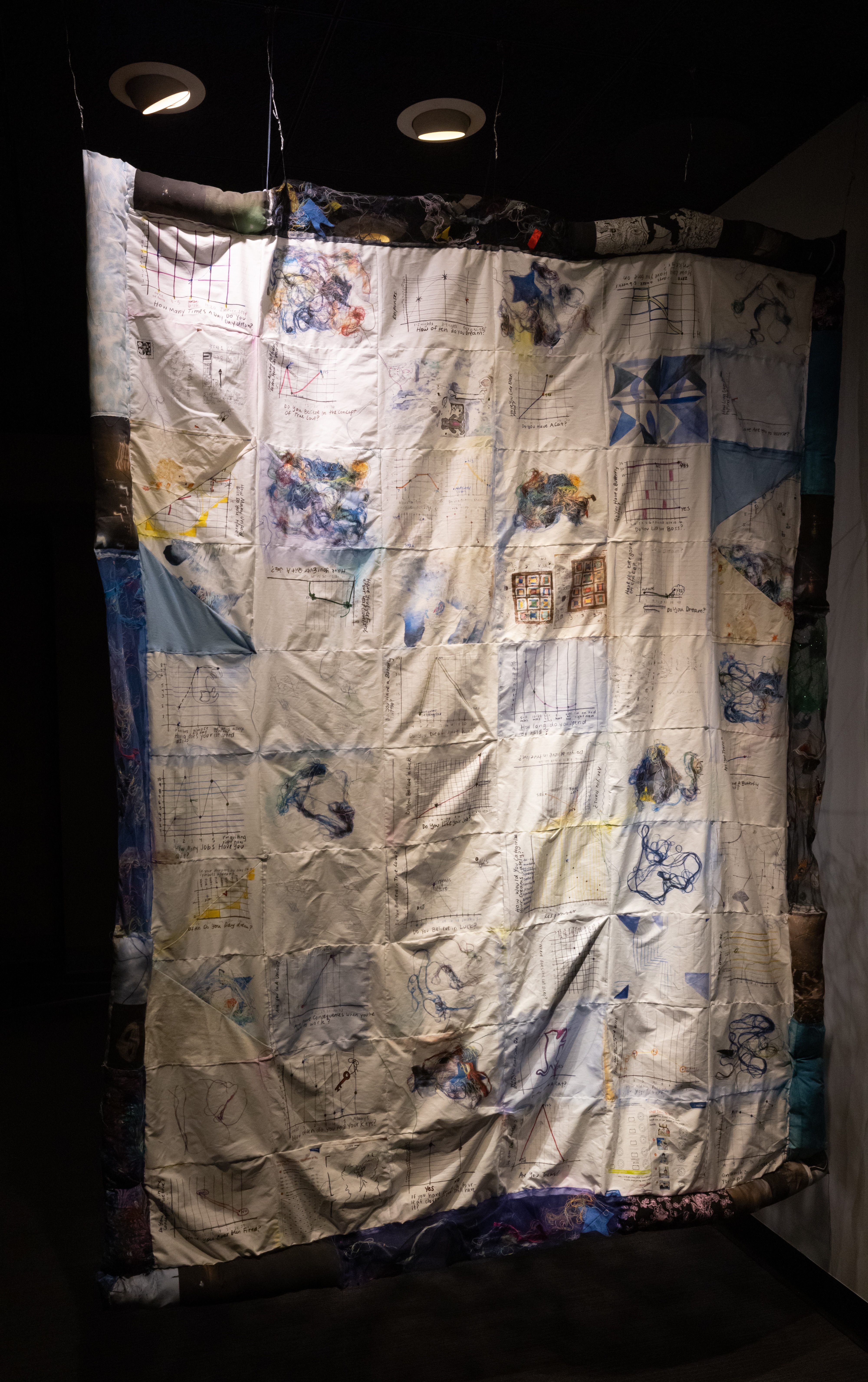 Spontaneous knotting of agitated string is a practical metaphor for predictable and unlikely probable entanglements. The quilt squares display graphs made from data collected by asking strange and mundane questions. Each axis of the graph poses questions that frame seemingly unrelated but possibly entangled events. The questions are a portrait of the questioner and tell as much about the collector as those the data is collected from. The quilt creates an interesting story of work, sleep, disability, belief, waiting, and action. It doesn’t seek to answer any hypothesis but instead uses data to draw wild and possibly inaccurate conclusions.