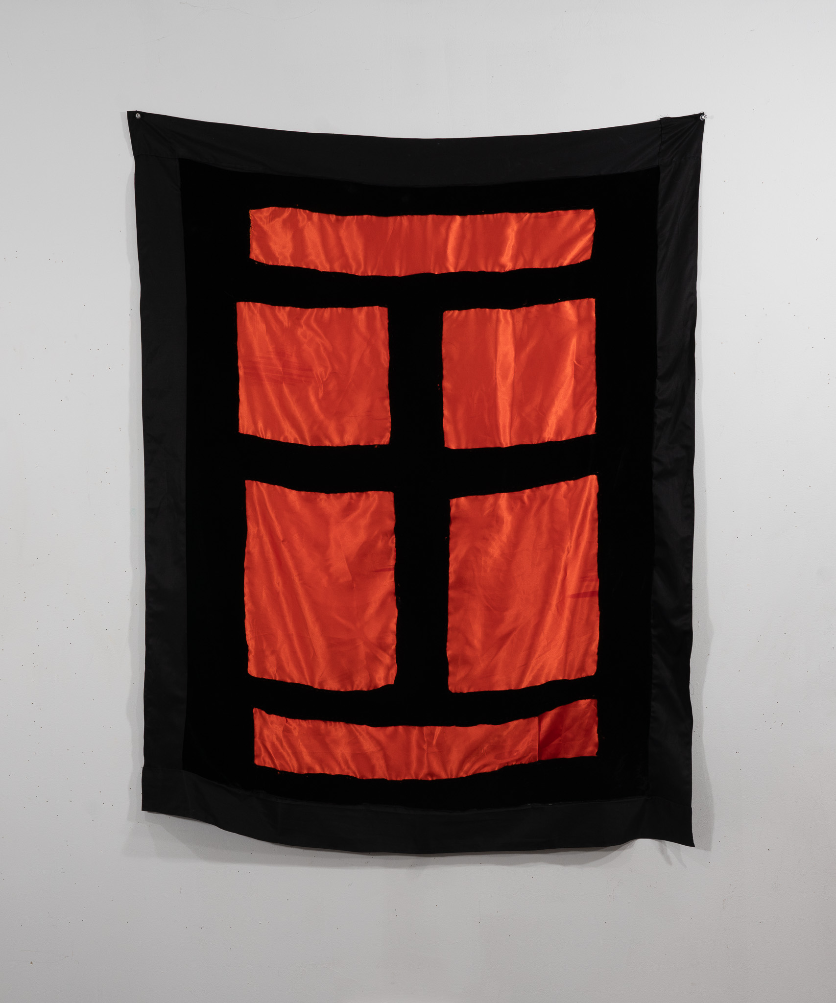 Window Quilt 1, silk velvet, satin, and a stage curtain, 36” x 44”, 2024